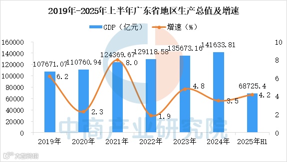 从经济发展情况来看,2024年,广东地区生产总值达141633.81亿元,总量连续36年稳居全国首位,占全国经济总量的10.5%,是全国经济稳定发展的重要支撑。广东服务业增加值、进出口总额、地方一般公共预算收入、国内税收收入、金融机构本外币存贷款余额、市场经营主体、研发经费支出、区域创新综合能力等多项指标继续稳居全国首位。2024年第一产业增加值5837.03亿元,增长3.4%;第二产业增加值54365.47亿元,增长4.4%;第三产业增加值81431.31亿元,增长2.8%,三次产业结构为4.1:38.4:57.5。2025年上半年,广东实现地区生产总值68725.40亿元,按不变价格计算,同比增长4.2%。其中,第一产业增加值2258.86亿元,增长4.2%;第二产业增加值25978.86亿元,增长3.4%;第三产业增加值40487.69亿元,增长4.6%。