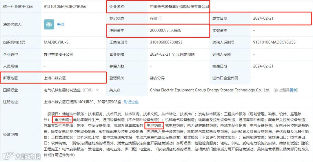 来自企查查的消息显示,2月21日,中国电气装备集团储能科技有限公司(简称“电气装备”)正式成立,法定代表人季侃,注册资本高达20亿元,所属地区上海市静安区。
