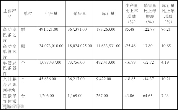 2023年,长光华芯高功率巴条芯片市场开拓较好,产、销、存均同比上升;单管及巴条器件销售数量降低,主要受客户需求的影响;直接半导体激光器业务开展较好,本期生产及销售数量均有上升。