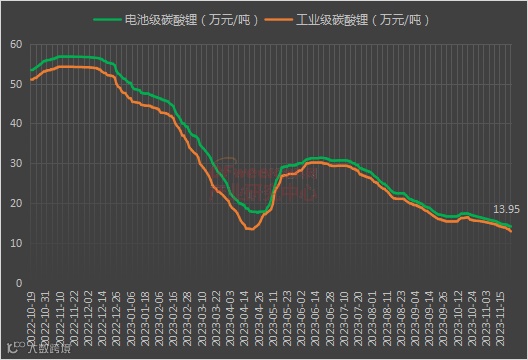 据SMM数据显示,截止11月23日,电池碳酸锂(99.5%/国产)报13.3-14.6万元/吨,日均价跌破14万元至13.95万元/吨,与去年高点对比,下跌超42万元/吨,暴利足以展现疯狂二字,行业大佬也调侃是给锂矿主打工的一年。