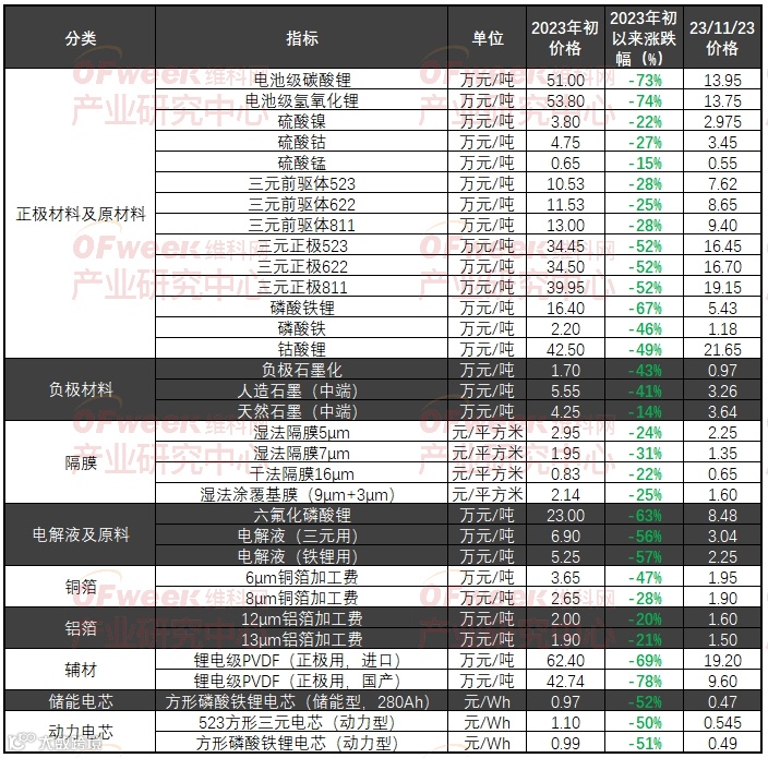 锂价仅是锂电材料产业链中最为突出的点,在锂电材料端,产能的超前布局与急速释放,直接激化了行业酝酿依旧的价格情绪,随着碳酸锂价格暴跌,锂电材料价格全线下滑。