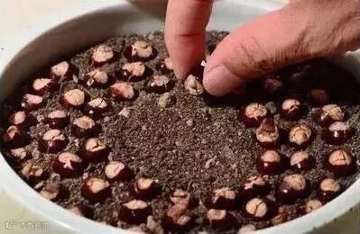 5、将发芽种子埋进去,根系朝下,头朝上,表面覆盖一层薄薄的石子,这样比较透气透水,也利于种子冒芽。