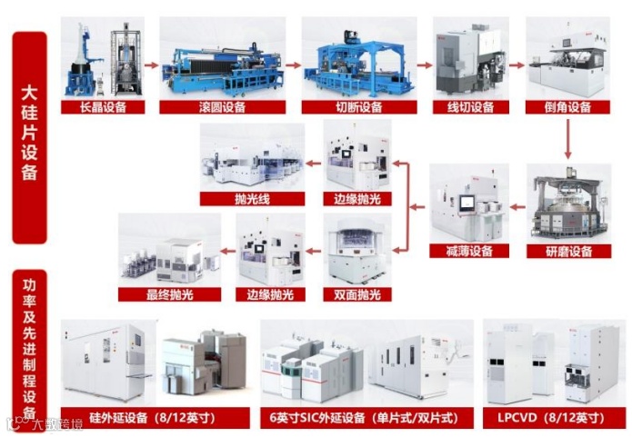 截至目前,晶盛机电拥有两大核心业务,先进装备和先进材料,其中先进装备包括单晶硅生长设备和单晶硅棒加工设备,先进材料包括蓝宝石晶体材料、碳化硅和硅。涉及半导体设备的板块主要是半导体用单晶硅生长炉,主要用于8-12英寸半导体大硅片的制造,另外还包括晶圆减薄设备、外延设备和LPCVD设备等。随着公司在半导体领域的深耕,半导体设备收入占公司总营收比重逐渐提升,根据公司各业务订单情况推测,半导体设备业务占比接近3成,营收规模在30亿元左右。