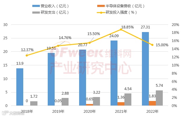 公司在半导体领域已经具备薄膜椭偏测量技术、光学关键尺寸测量技术、高分辨率电子束检测技术三大核心技术,可用于高性能膜厚量测设备、高精度光学关键尺寸量测设备、先进晶圆在线电子束缺陷复查和分类设备中。截至2023年10月,来自半导体行业的订单金额已接近15亿,占公司全部在手订单的46%,并超越了公司主业显示业务。2022年公司总营收达到27.31亿元,是2018年的一倍多,同时,公司研发投入也从2018年的1.72亿元大幅提升至2022年的5.74亿元,研发投入强度保持在10%以上的水平。公司半导体检测设备业务占比逐年提高,2022年达到1.83亿元,主流晶圆制造厂中芯国际、华虹集团、长江存储、合肥长鑫等均是精测电子客户。