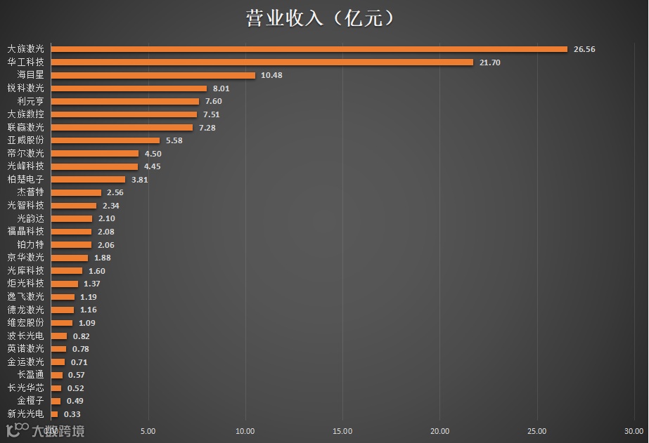 从营业收入排名来看,大族激光(26.56亿元)和华工科技(21.70亿元)依旧以超20亿元的营收问鼎一季度榜一、榜二的宝座。