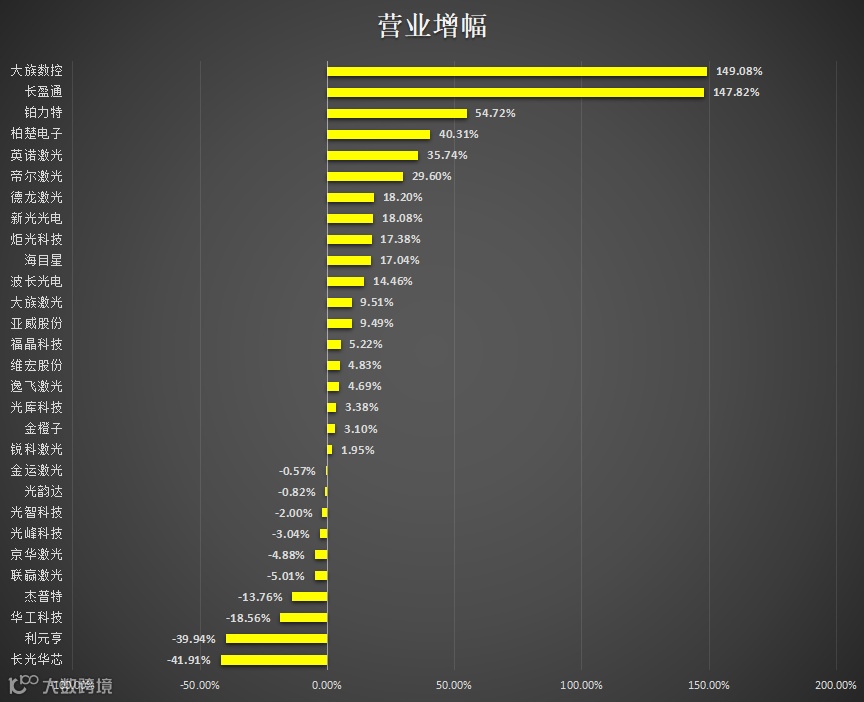从营收增幅上看,大族数控和长盈通一季度实现营收倍增,分别同比增长149.08%、147.82%。