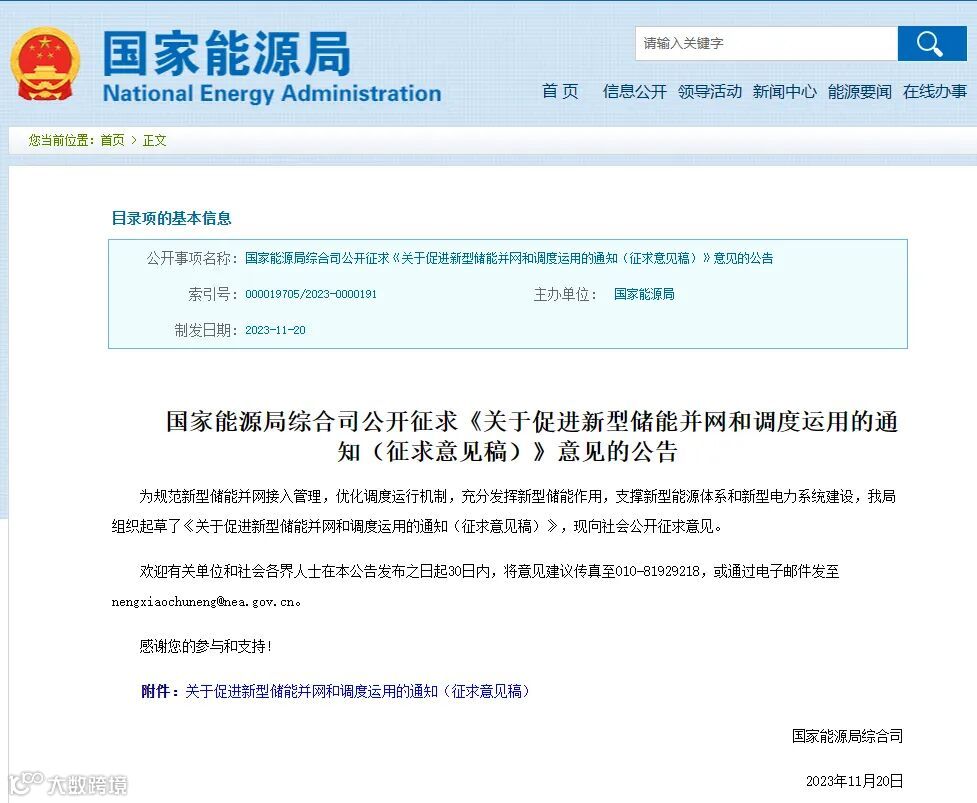 11月20日,国家能源局综合司发布公开征求《关于促进新型储能并网和调度运用的通知(征求意见稿)》意见的公告。