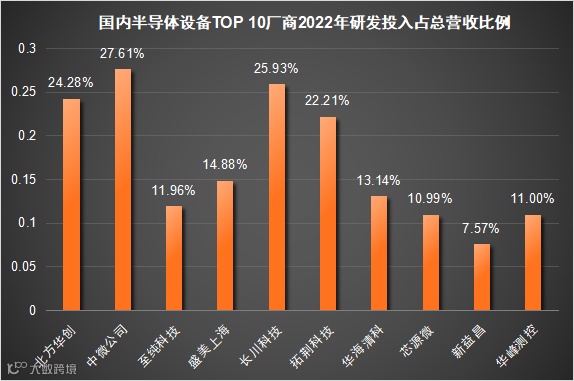 从研发投入来看,中微公司的研发投入占比最高,达到了27.61%。研发投入占比超过20%的还有北方华创(24.28%)、长川科技(25.93%)、拓荆科技(22.21%)。研发投入占比最低的是新益昌为7.57%。