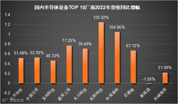 从营收增幅来看,拓荆科技以125.02%的同比增幅排在第一位,还有一家华海清科以104.86%的增幅同样突破了100%增长的大关。剩下的八家企业中,北方华创、中微公司、盛美上海、长川科技、芯源微5家企业营收增幅均超过50%,只有新益昌一家企业营收增幅为负(-1.09%)。