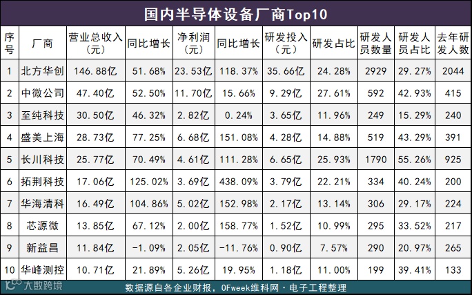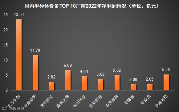 从净利润来看,北方华创以23.53亿元位居第一,紧随其后的是中微公司(11.70亿元)。除此之外,剩下八家企业净利润均在10亿元以内。值得注意的是,TOP 10厂商净利润均表现为正值,无一亏损。