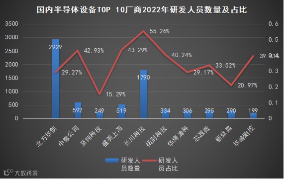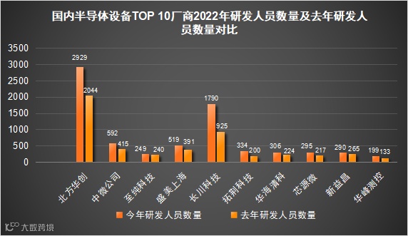值得注意的是,笔者还对比了这10家企业2022年研发人员与去年的研发人员数量的情况,发现10家企业研发人员均有所增加,体量越大的公司比如北方华创、长川科技等,一年来新招的研发人员数量越多,这也意味着公司在技术人才的投入方面更加重视。也变相的说明,在近两年芯片大环境不好的背景下,半导体设备行业尚未出现大规模裁员的情况。