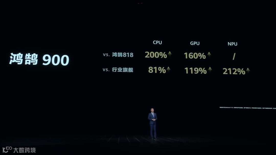 鸿鹄900,对比上一代鸿鹄818,CPU性能提升200%,GPU提升160%,相比于行业旗舰芯片,CPU性能提升81%,GPU提升119%,在NPU上更是提升高达212%。