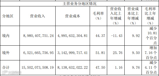 而国内市场的毛利率只有44.37%,同比下滑10.81%。