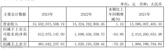 2023年,该公司实现总营收155.02亿元,同比增长1.16%;归母净利润6.12亿元,同比下降63.96%;扣非归母净利润4.84亿元,同比下降70.26%。