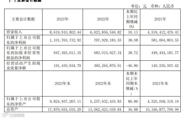 根据官方2023年财报披露,报告期内,中控技术实现营业收入86.2亿元,同比增长30.13%;归属于上市公司股东的净利润11.02亿元,同比增长38.08%;扣非归母净利润9.47亿元,同比增长38.72%。