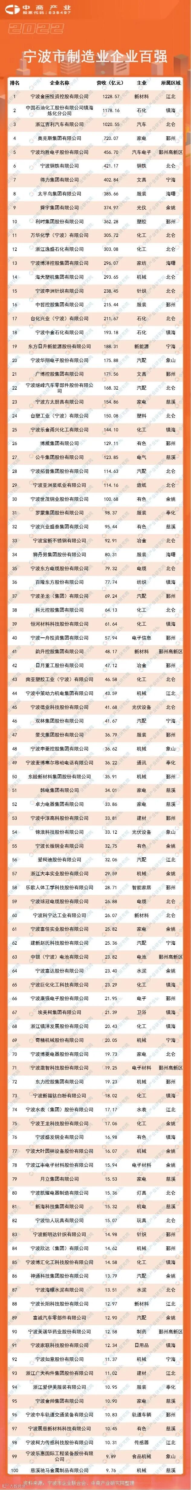近日,宁波市企业联合会、宁波市企业家协会、宁波市工业经济联合会共同发布了2022宁波市制造业企业百强榜单。榜单显示,百强企业累计营业收入12490.0亿元,入围门槛达9.76亿元。