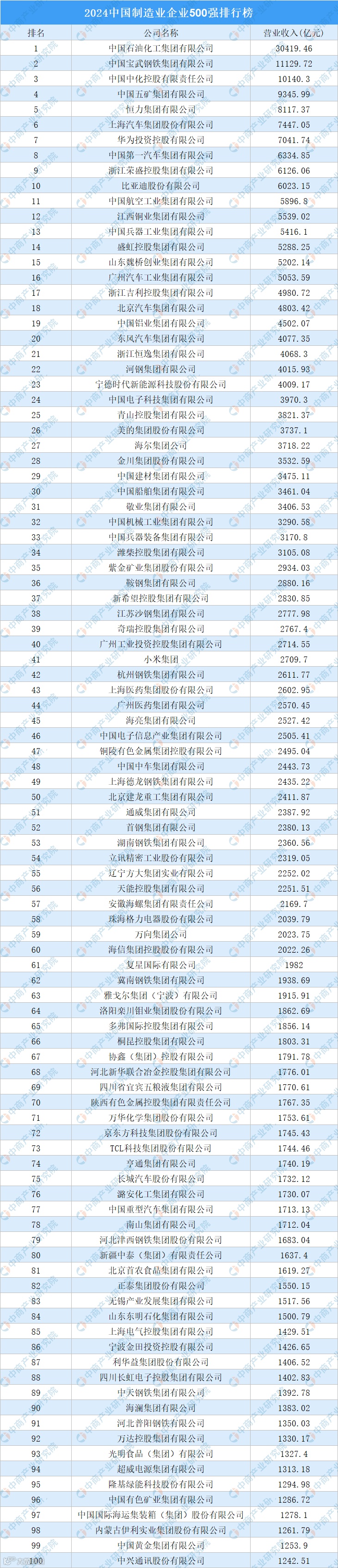 2024中国制造业企业500强中,124家企业营业收入超千亿,16家企业营业收入超5000亿元,3家企业营业收入超万亿。从排名来看,中国石化以30419.46亿元营业收入位居榜首,中国宝武、中国中化排名第二和第三,营业收入分别为11129.72亿元、10140.3亿元。中国五矿、恒力集团、上汽集团、华为、中国一汽、荣盛集团和比亚迪进入前十,依次排名第4-10名。