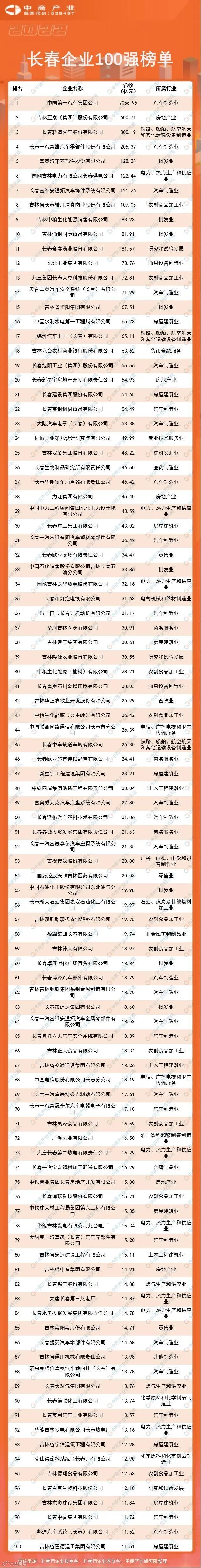 2022长春企业100强榜单