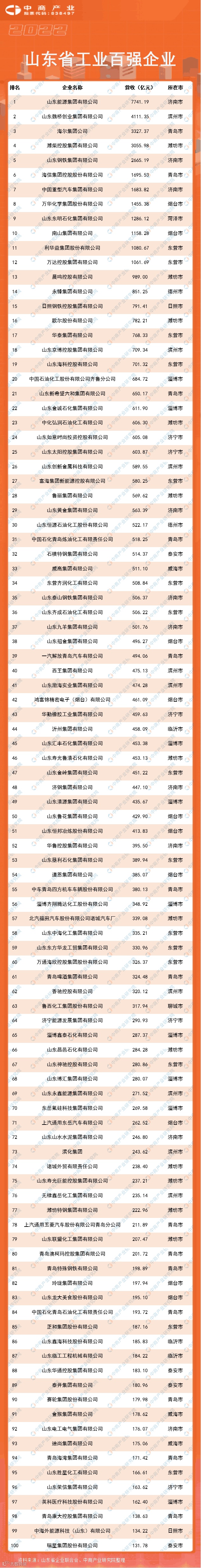 近日,山东省工业和信息化厅、省企业联合会公布了2022山东工业百强企业名单。榜单显示,山东工业百强企业营收达64423.53亿元,入围门槛为131.78亿元。