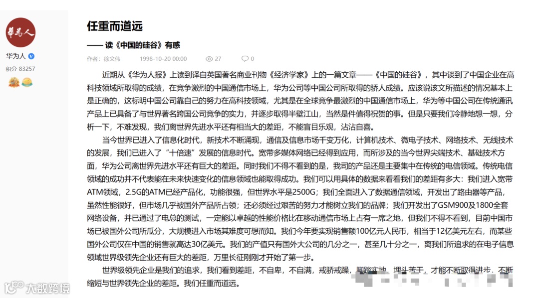 1998 年,徐文伟曾发表“任重而道远-读《中国的硅谷》有感”一文,文中提到,“世界级领先企业是我们的追求,我们看到差距,不自卑,不自满,戒骄戒躁,埋头苦干 ...... 不断缩短与世界领先企业的差距,我们任重而道远。”