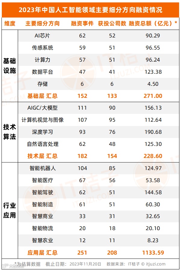IT 桔子数据显示,截止到 2023 年 11 月 20 日,今年中国人工智能赛道在一级市场的总融资事件数有 530 起,与去年同期相比减少 26%;总融资交易额估算有 631 亿元,与去年同期相比下降 38%。