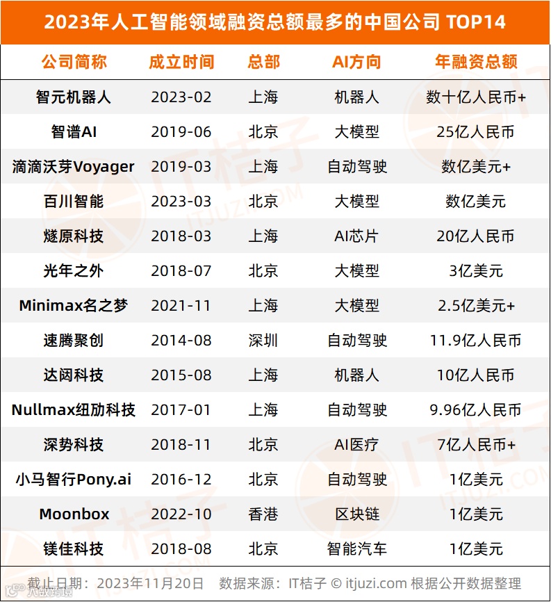 有 14 家公司今年获得了 1 亿美元以上的融资。分别是智元机器人、智谱 AI、滴滴沃芽 Voyager、百川智能、燧原科技、兆年之外、Minimax名之梦、速腾聚创、达闼科技、Nullmax纽励科技。