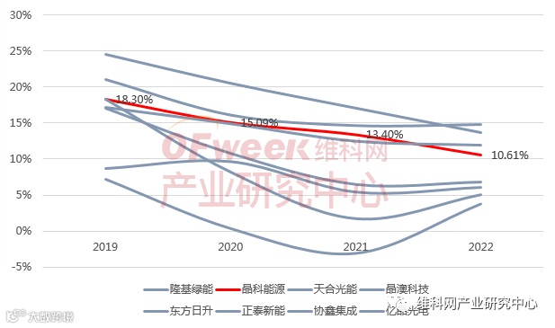 从毛利水平来看,晶科能源组件产品毛利率水平不高,相对于行业来说,处于中等偏上位置,与隆基、晶澳相比始终处于劣势地位,2022年被天合光能挤占了第三名的位置。但相对于东方日升、正泰以及其他组件厂商仍具备一定优势。