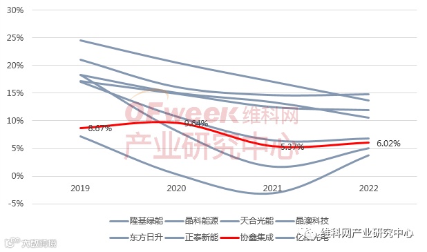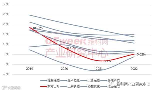东方日升组件产品毛利率近年来下滑比较明显,近三年相较头部企业差距较大,2021年更是下降至仅1.71%,2022年有所回升,为5.02%。