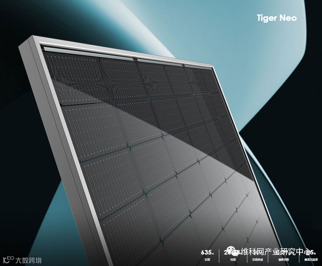 晶科能源光伏组件产品目前以单晶组件为主,在具备PERC、TOPCon、双面(含双玻和透明背板技术)、半片、叠焊、多主栅、大尺寸等电池及组件工艺技术前提下,晶科能源差异化地开发并推出了多个系列光伏组件产品,2020年推出搭载182mm大尺寸电池片的TigerPro系列产品,2021年11月推出应用了N型TOPCon电池技术的TigerNeo系列高端组件产品,截至2022年底,TigerNeo78片组件功率最高突破620瓦。