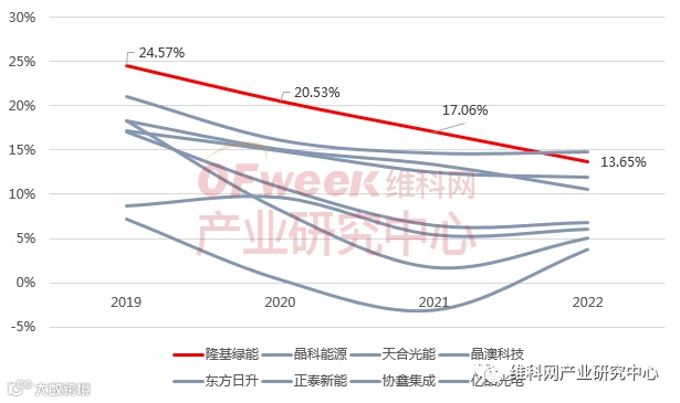 在“拥硅为王”的行业背景下,组件作为直接对接下游应用领域的环节,利润空间被硅料和电站两头挤压,从隆基绿能组件业务毛利率水平的变动可见一斑。2019-2022年,隆基绿能组件业务毛利率从24.57%一路下降至13.65%,但总体来看,隆基绿能组件毛利率水平仍处于行业顶尖水平,仅在2022年被晶澳科技以微弱优势超越。随着硅料价格的大幅“腰斩”,隆基绿能对外透露2023年组件毛利率水平将会得到修正,有望达到19%。