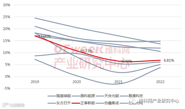 从组件产品毛利率水平看,正泰新能毛利率变动趋势与行业保持一致,近4年持续走低,2022年为6.81%,同比略有提升,相比隆基、晶科、晶澳、天合等头部企业仍较低,提升空间较大。