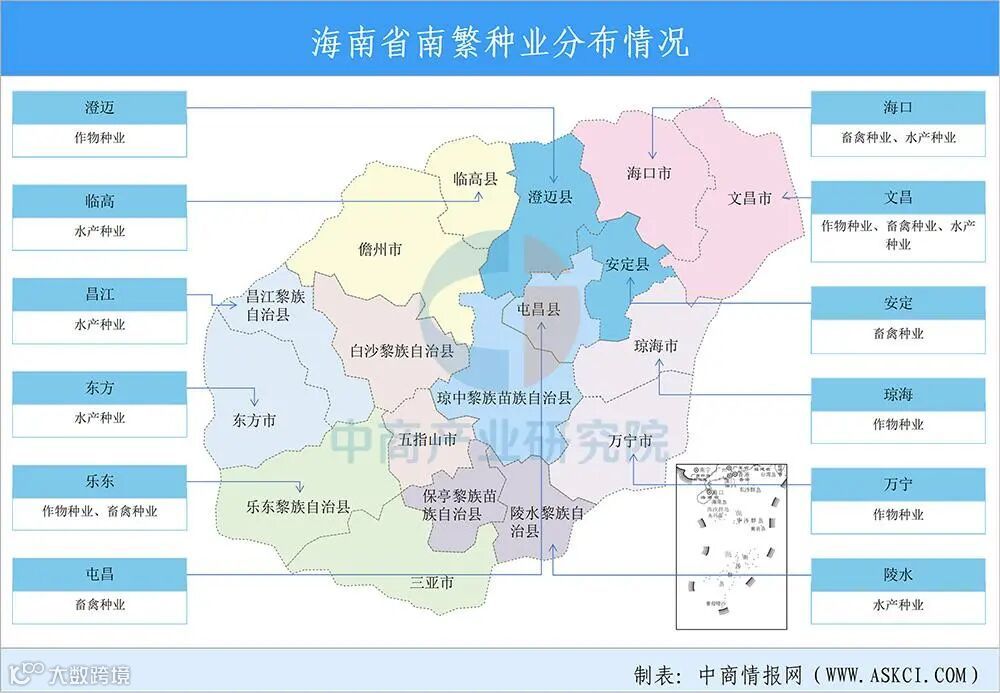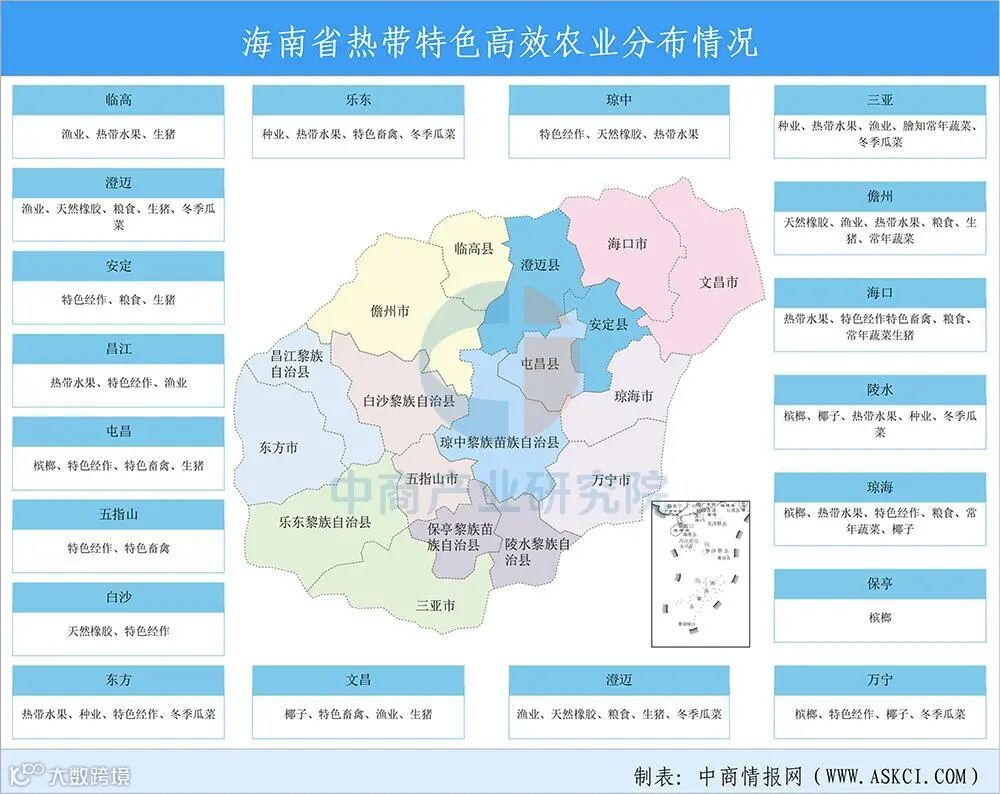海南以“海澄文定”北部瓜菜基地和“大三亚”南繁育种基地为重点,强化北部都市农业、南部农旅融合功能,梯次推进,进而带动东部滨海现代农业、西部高效热带瓜果农业拓展,促进中部丘陵山地生态农业发展。海南综合考虑各市县区域特点、区域定位、产业基础和未来方向等因素,确定各市县重点产业。