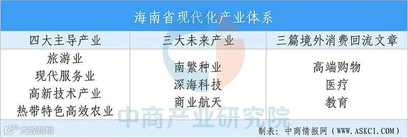 海南省重点发展“4+3+3”产业体系:四大主导产业(旅游业、现代服务业、高新技术产业、热带特色高效农业)、三大未来产业(南繁种业、深海科技、商业航天)、三篇境外消费回流文章(高端购物、医疗、教育)。