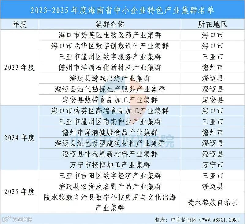 2023-2025年度海南省共有16个产业集群被认定为海南省中小企业特色产业集群,涵盖海口、三亚、澄迈、儋州洋浦、定安、万宁、陵水8个市县,其中澄迈县(5个)、海口市(3个)、三亚市(3个)为核心承载区,占总集群数的68%。
