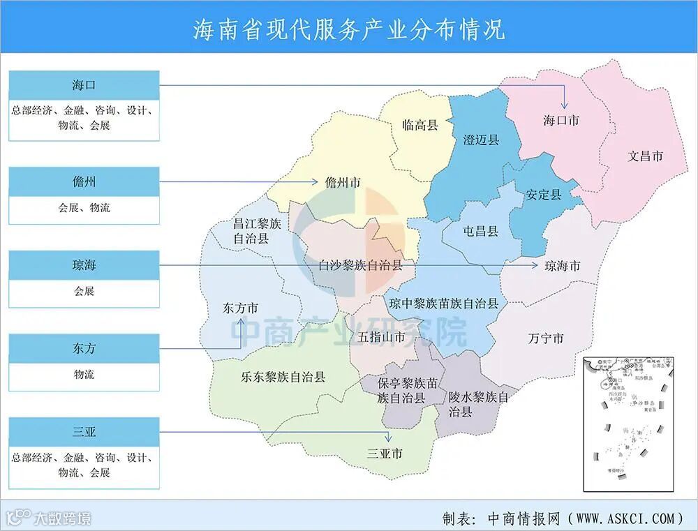 海口江东新区、三亚中央商务区充分发展总部经济、金融、咨询、设计等现代服务业;打造洋浦、海口、三亚、东方四个物流集聚区;以博鳌乐城国际医疗旅游先行区为核心,打造世界一流的国际健康旅游目的地、全球领先的医疗创新平台;以海口、三亚、琼海、儋州等为重点,构建差异化发展的会展业空间格局。