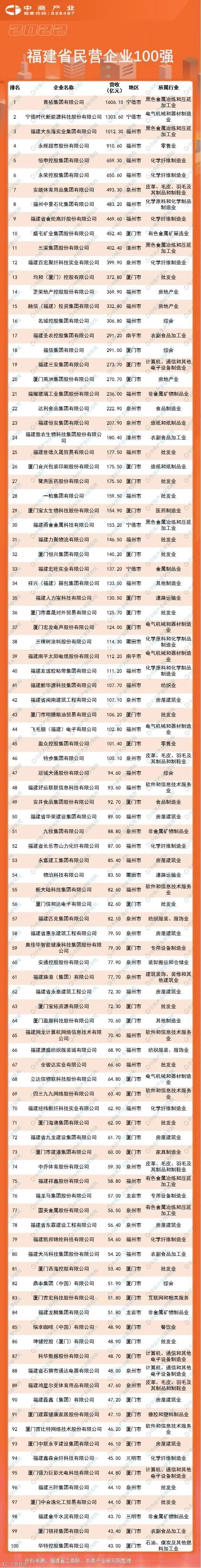 前三企业为青拓集团有限公司、宁德时代新能源科技股份有限公司、福建大东海实业集团有限公司,营收分别达到1606.10亿元、1303.60亿元、1012.3亿元。