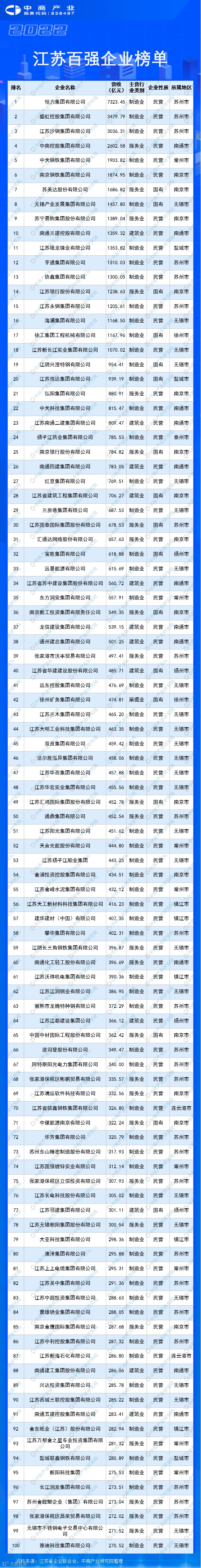 从营收规模来看,前十企业分别为恒力集团有限公司、盛虹控股集团有限公司、江苏沙钢集团有限公司、中南控股集团有限公司、中天钢铁集团有限公司、南京钢铁集团有限公司、苏美达股份有限公司、无锡产业发展集团有限公司、苏宁易购集团股份有限公司、南通三建控股有限公司。