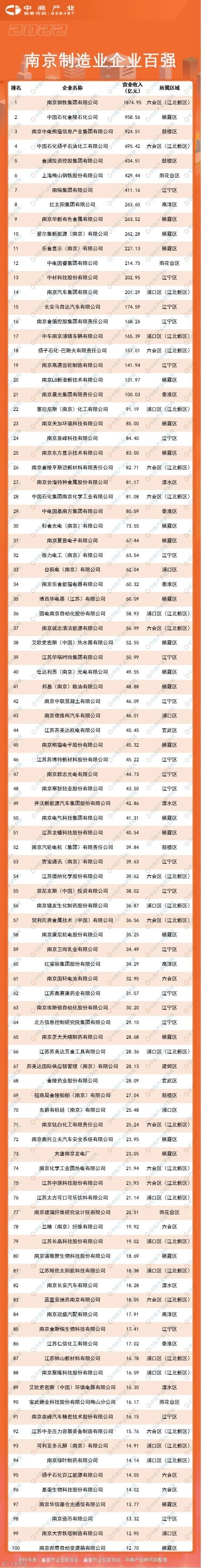 南京钢铁集团有限公司、中国石化金陵石化公司、南京中电熊猫信息产业集团有限公司、中国石化扬子石油化工有限公司、金浦投资控股集团有限公司、上海梅山钢铁股份有限公司、南瑞集团有限公司、红太阳集团有限公司、南京华新有色金属有限公司、爱尔集新能源(南京)有限公司进入南京制造业百强榜前十。