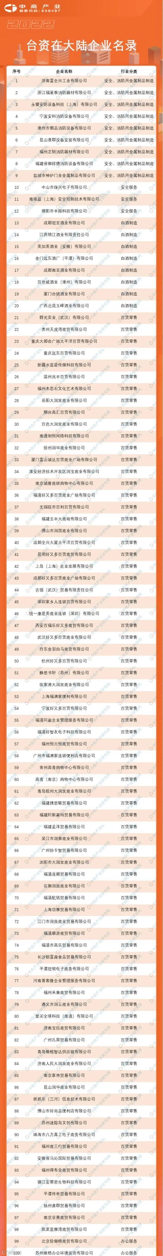 截至2020年底,台湾累计在大陆投资企业近12万家,占比约为11%。截至2021年,台湾累计在大陆实际投资达到713.4亿美元。本次中商产业研究院节选了500家企业,如若需要完整台资在大陆企业名录,请关注微信公众号招商情报库。