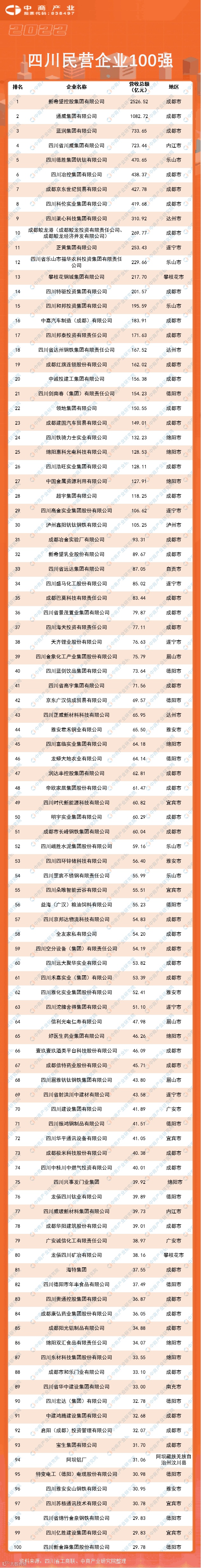 日前,四川省工商联在成都发布2022年四川民营企业100强榜单。榜单显示,新希望控股集团有限公司、通威集团有限公司、蓝润集团有限公司位列营业收入前三名,营收分别为2526.52亿元、1082.72亿元、733.65亿元。