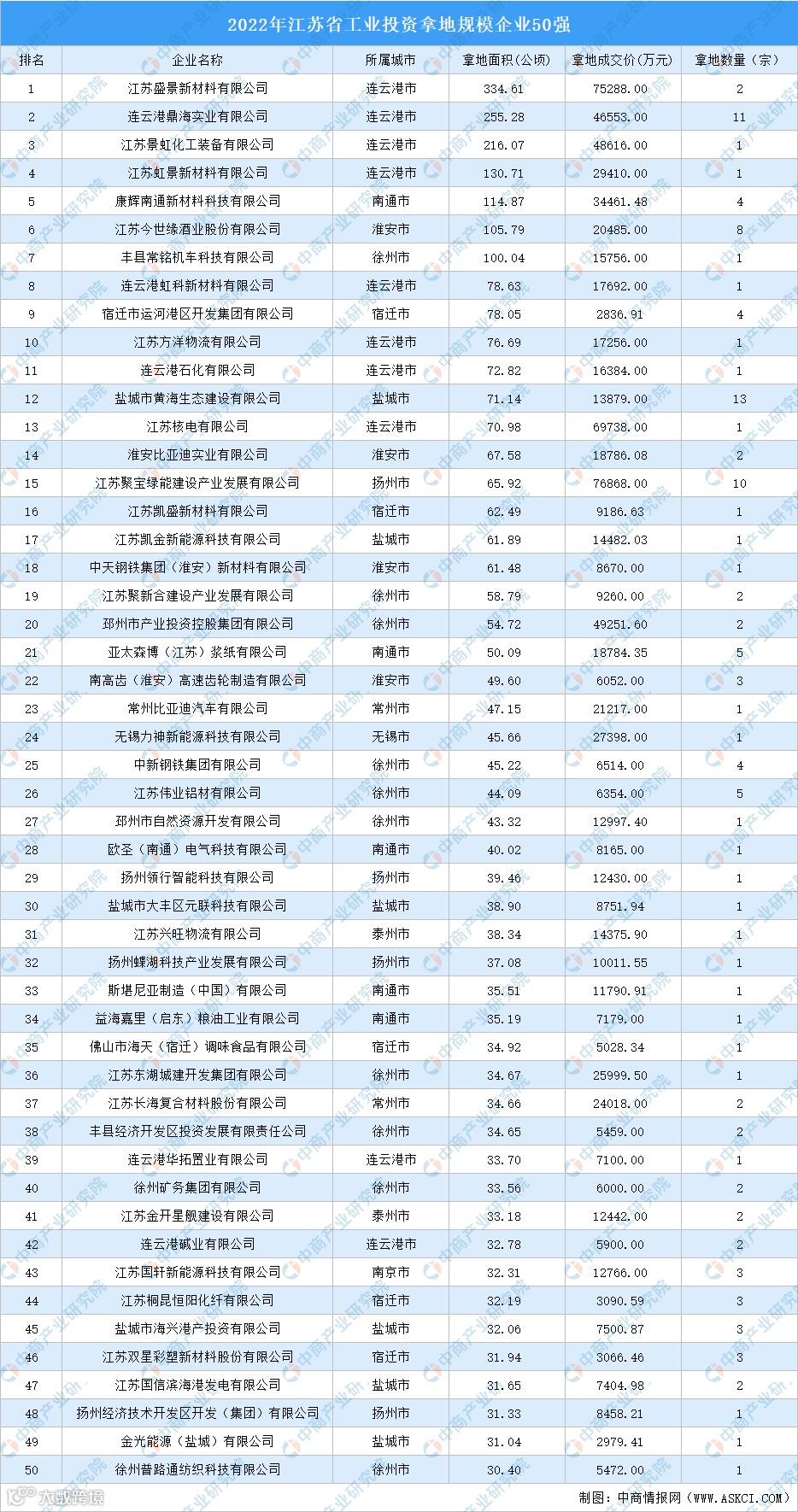 榜单显示,2022年江苏省投资拿地规模最大的10家企业分别为江苏盛景新材料有限公司、连云港鼎海实业有限公司、江苏景虹化工装备有限公司、江苏虹景新材料有限公司、康辉南通新材料科技有限公司、江苏今世缘酒业股份有限公司、丰县常铭机车科技有限公司、连云港虹科新材料有限公司、宿迁市运河港区开发集团有限公司、江苏方洋物流有限公司。其中,江苏盛景新材料有限公司拿地面积最大达334.61公顷。