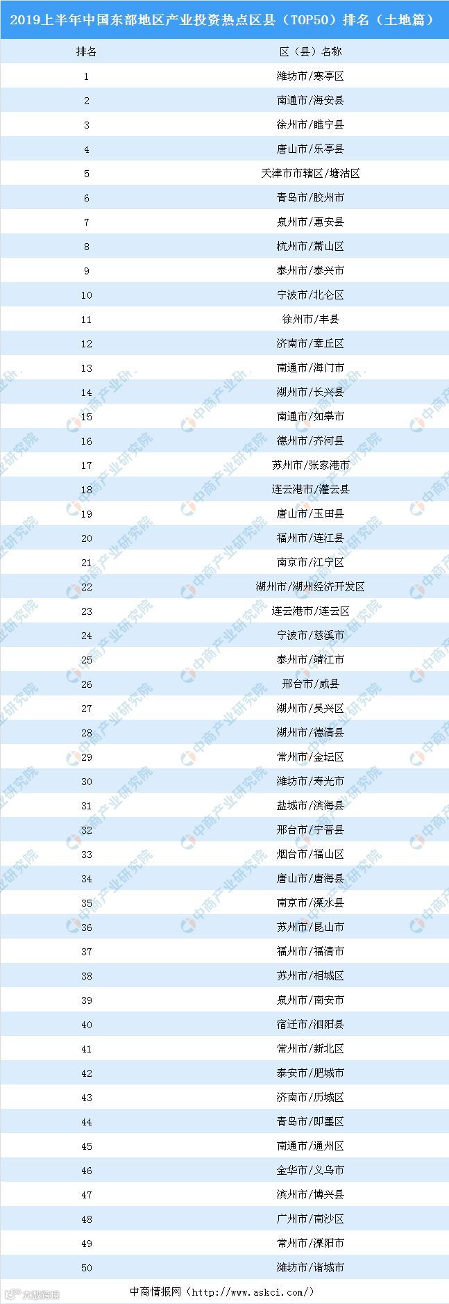 虽说部分产业转移到中西部,但东部仍然占领政策扶持高地,走在产业升级发展的前端,未来其发展重点在战略性新兴行业和交运、金融、信息等生产性服务业,加快进入工业4.0时代占据产业结构的高地,代表东部地区产业地产的核心—产业将会有更大的容量空间。东部沿海区域将加快进入工业4.0时代,各城市也将抓住自身的行业和基地,进行差别化竞争。随着长江经济带上升为国家战略,基建、港口将催生大量的产业地产机会,尤其是航运能力提高将极大刺激物流地产需求等。由于东部地区经济水平相当发达,凭借其得天独厚的资源优势、交通优势以及政策扶持等各种因素的影响下,东部地区得到了众多企业青睐,纷纷前来拿地投资,土地市场热度不减。以下是2019上半年中国东部地区产业投资热点区县TOP50详细排名情况: