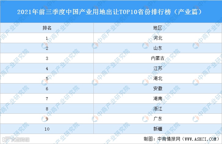 产业地产投资情报:2021年前三季度中国产业用地出让TOP10省份排名