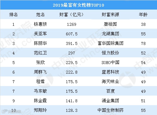 虽然遭遇房地产行业调控力度加大、股价大幅跳水等不利因素,来自碧桂园的杨惠妍女士今年再度蝉联中国最富有女性榜榜首,身家达1269亿元。龙湖集团董事长吴亚军以607.5亿元财富位列第二。富华国际集团主席陈丽华排第三,身家达391.5亿元。进入榜单前十的女性还有:恒力股份范红卫、SOHO中国张欣、蓝思科技周群飞、海天味业程雪、百度马东敏、涌金集团陈金霞、中国生物制药郑翔玲。