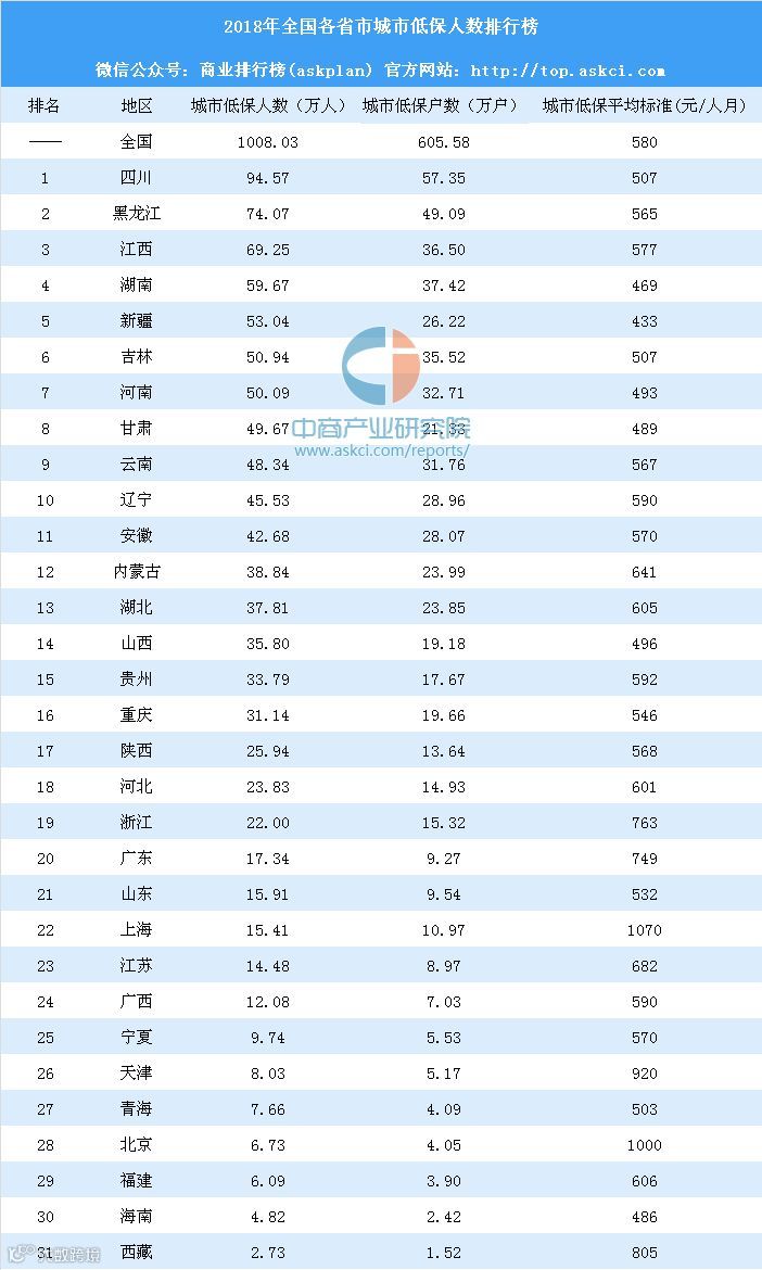 其中,四川、黑龙江、江西、湖南、新疆、吉林、河南城市低保对象超50万人,其中四川城市低保对象最多,共计94.57万人。