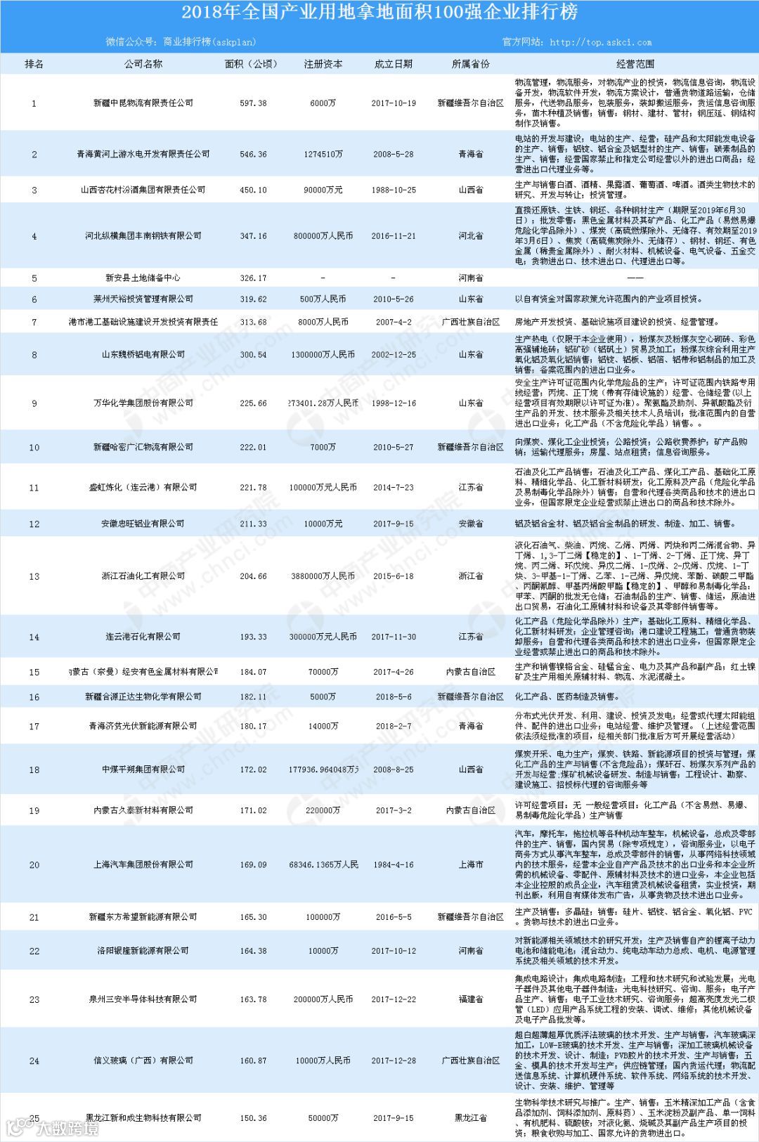 据中商产业研究院产业地产情报库监测数据显示,2018年全国产业用地拿地面积100强企业榜单已出炉。据榜单显示,2018年全国产业用地拿地面积排名前十企业的分别是:新疆中昆物流有限责任公司、青海黄河上游水电开发有限责任公司、山西杏花村汾酒集团有限责任公司、河北纵横集团丰南钢铁有限公司、新安县土地储备中心、莱州天裕投资管理有限公司、防城港市港工基础设施建设开发投资有限责任公司、山东魏桥铝电有限公司、万华化学集团股份有限公司以及新疆哈密广汇物流有限公司。其中,新疆中昆物流有限责任公司以597.38公顷的用地拿地面积位列榜首;其次,青海黄河上游水电开发有限责任公司2018年拿地用地面积为546.36公顷,位列排行榜第二;山西杏花村汾酒集团有限责任公司则排名第三,2018全年产业用地拿地面积为450.1公顷。