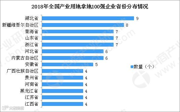 从产业用地拿地面积百强企业省份分布来看,2018年产业用地拿地面积100强企业分布在湖北省最多,达到9家;其次为新疆区,为8家;青海、山东和浙江省则均为7家。