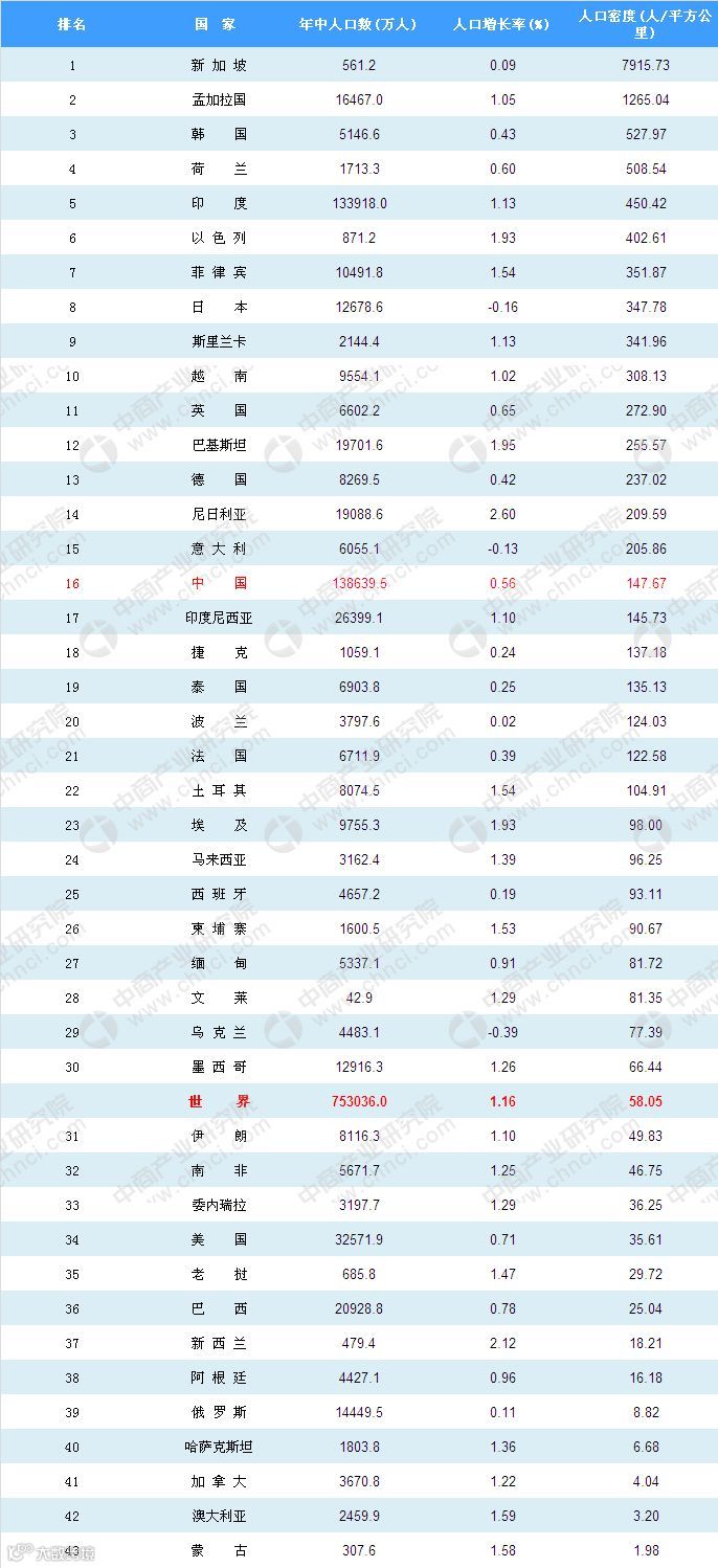 招商资源库据中商产业研究院整理数据显示:2017全球约75.3亿人。2017年国际主要国家人口密度最大的前十国家分别是新加坡、孟加拉国、韩国、荷兰、印度、以色列、菲律宾、日本、斯里兰卡和越南。其中,新加坡全球人口密度最高,日本排名第八。全球平均人口密度为58.05人/平方公里,中国人口密度排名第16位,为147.67人/平方公里,高于全球水平。