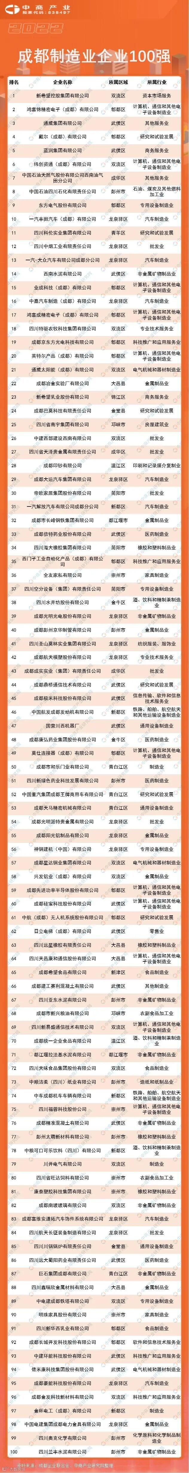2022成都制造业企业100强排行榜