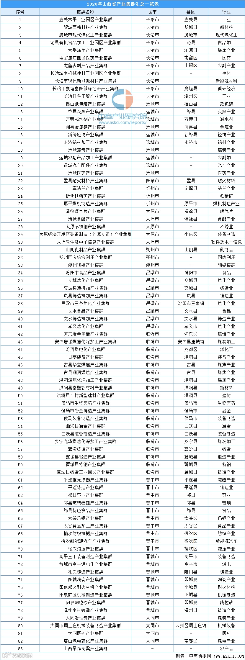 产业集群往往集聚了产业链上下游的企业,是地方招商的重要目的。为此,中商产业研究院整理出山西省80余个产业集群。
